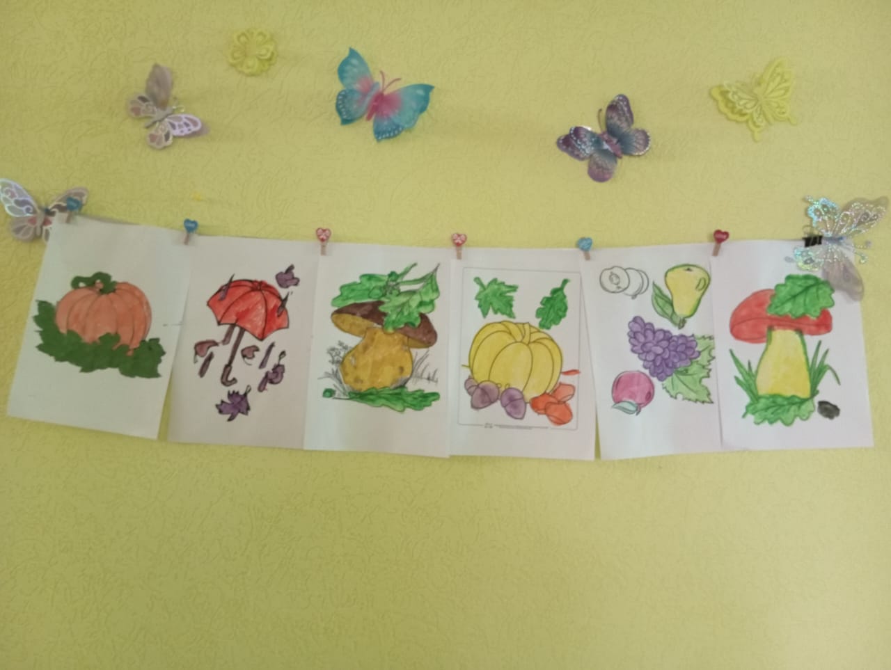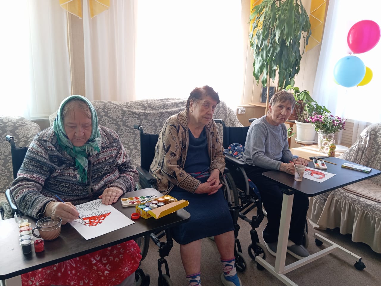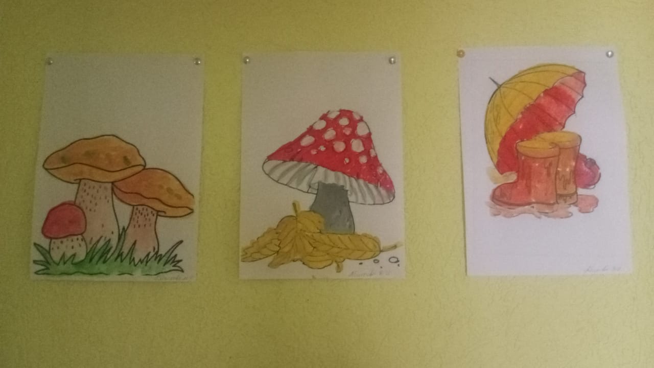 В прохладную дождливую погоду досуг получателей услуг в стационарных отделениях не должен угасать, а потому в Боргустанском отделении взяли на вооружение бумагу, кисти и краски. Грибы, овощи, листочки и различные лепесточки — все это потребовало немалого внимания и усердия от проживающих в стационаре. А после окончания занятий по ИЗО была устроена своеобразная выставка из получившихся рисунков.