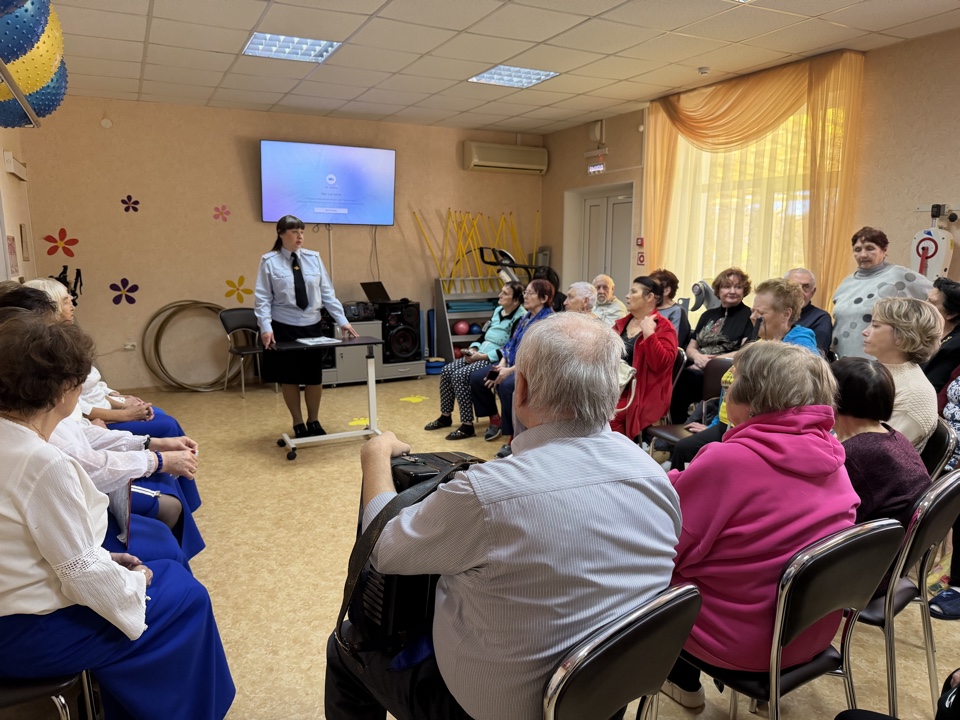 Юрисконсульт правовой группы Отдела МВД России «Предгорный» Ирина Алышева провела беседу «Как защититься от онлайн-мошенников» с получателями социальных услуг социально-оздоровительного, отделения. Она подробно разъяснила участникам беседы о схемах действий преступников и о правильной реакции на телефонные звонки с незнакомых номеров.