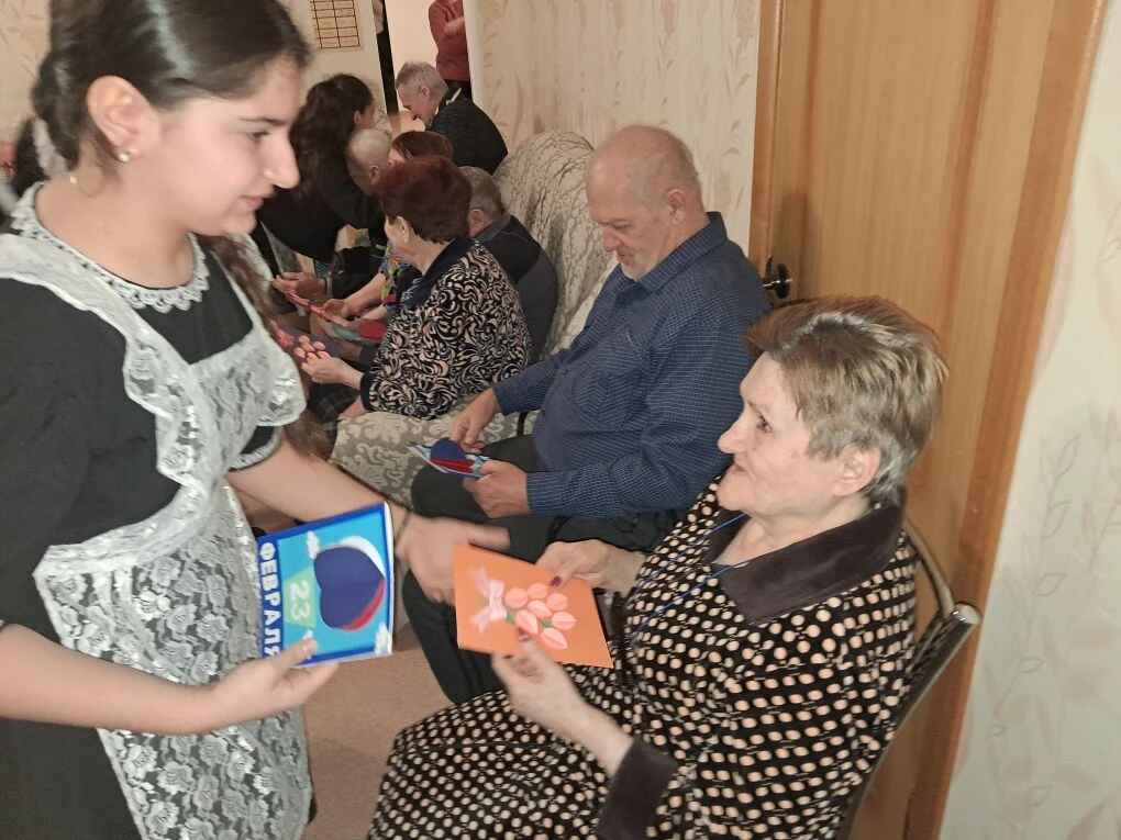 Самым трогательным моментом встречи стало вручение подарков. Ученицы вручили каждому жителю открытки, сделанные своими руками. В них они вложили не только добрые пожелания, но и настоящую детскую любовь. А для прекрасной половины отделения юные мастерицы приготовили особый сюрприз — нежные букеты роз, выполненные в технике «бумажная флористика».