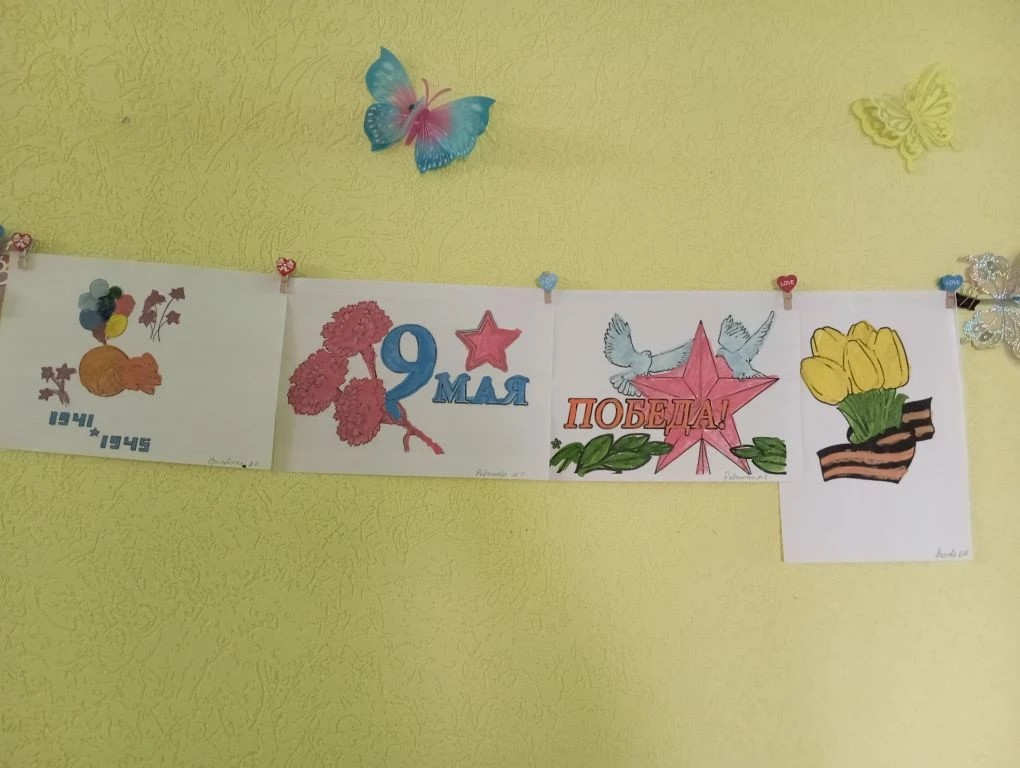 По доброй традиции в отделении открылась мини-выставка рисунков, посвящённая подвигу советского народа. Работы, выполненные с душой и трепетом, отражают главные символы праздника: салют Победы, журавлей памяти, вечный огонь.